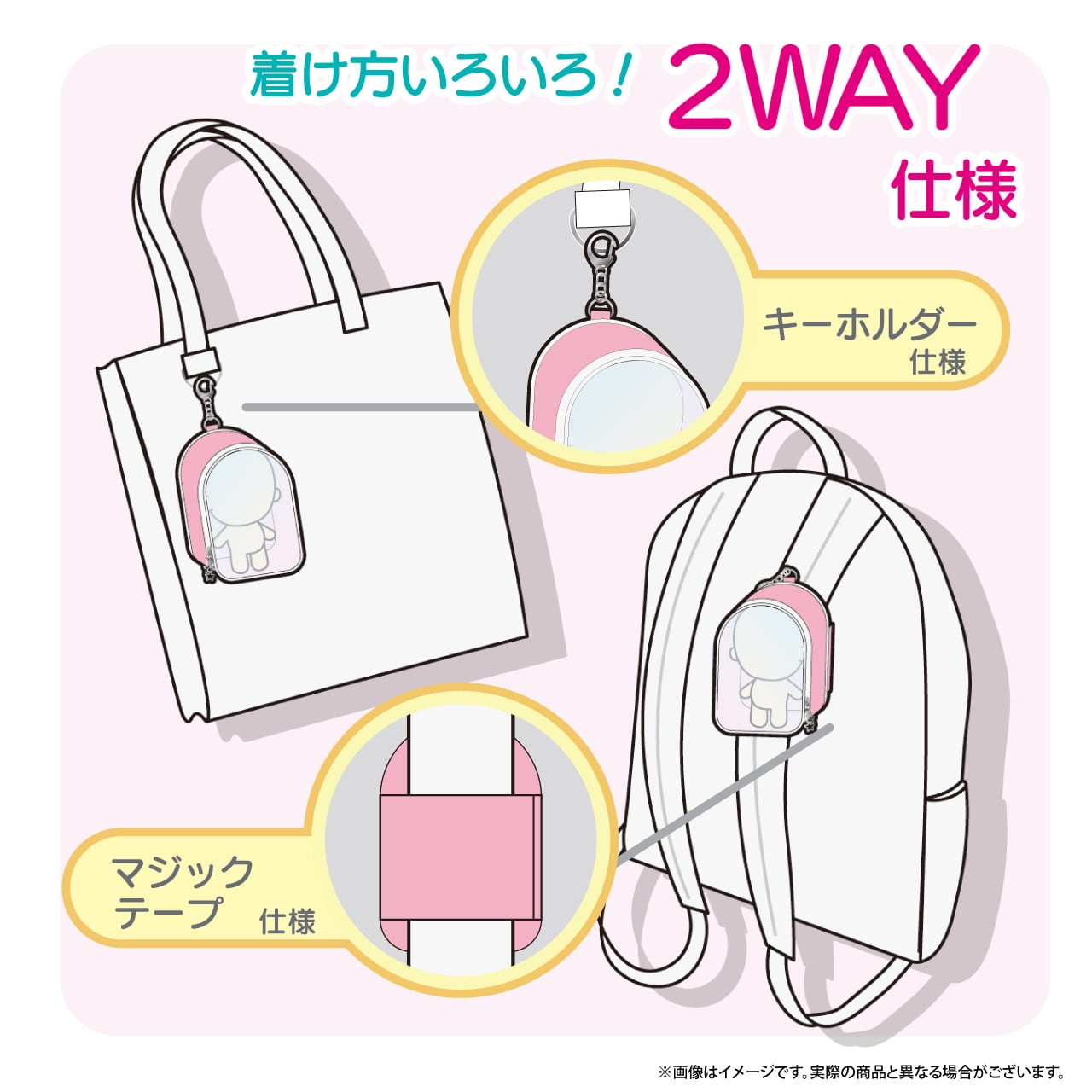 用途に合わせた2種類の取り付け方法で、バッグや家の中など、好きな場所に推しぬいを飾れます!